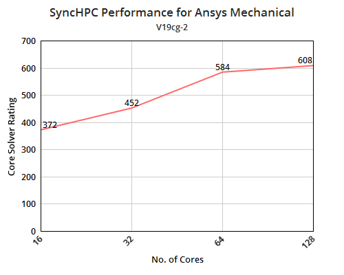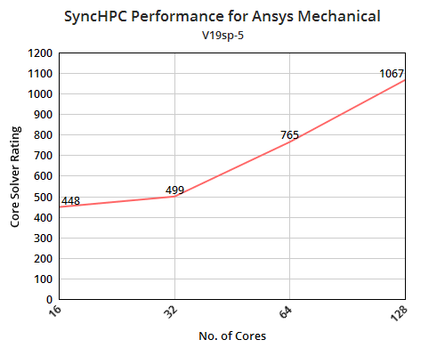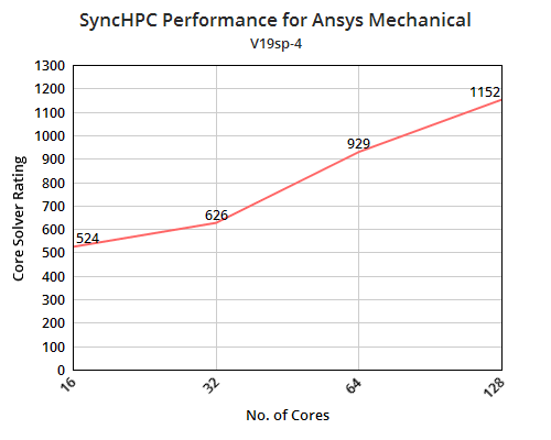 Each problem was solved on 16, 32, 64 and 128 CPU cores. Please note that below examples are standard benchmark problems provided by ANSYS. Also, they are run for fixed number of iterations. This will help you to compare performance of SyncHPC cloud platform with other hardware vendors from ANSYS mechanical benchmarks.