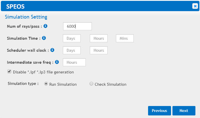 3. SPEOS specific settings like Number of rays/ Pass, Simulation time, Scheduler wall clock, etc are also provided.