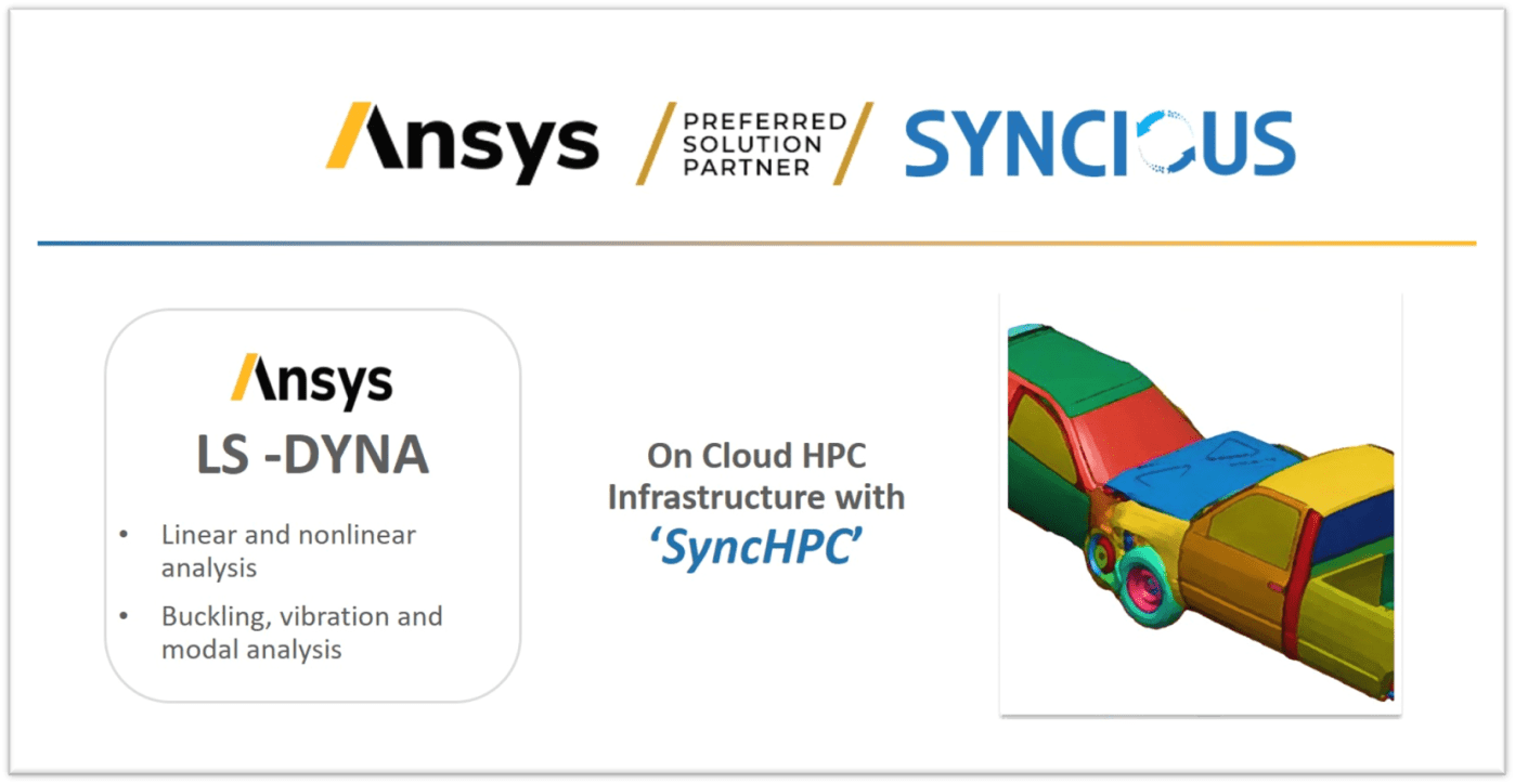 SyncHPC platform provides a simplified simulation workflow for cloud HPC. Also, users can take benefit of unlimited cloud scalability for linear performance improvement of LS-DYNA simulations.