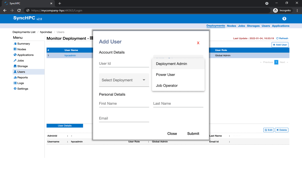 Admin can add multiple users and assign them a specific role and access control to use ‘SyncHPC’.