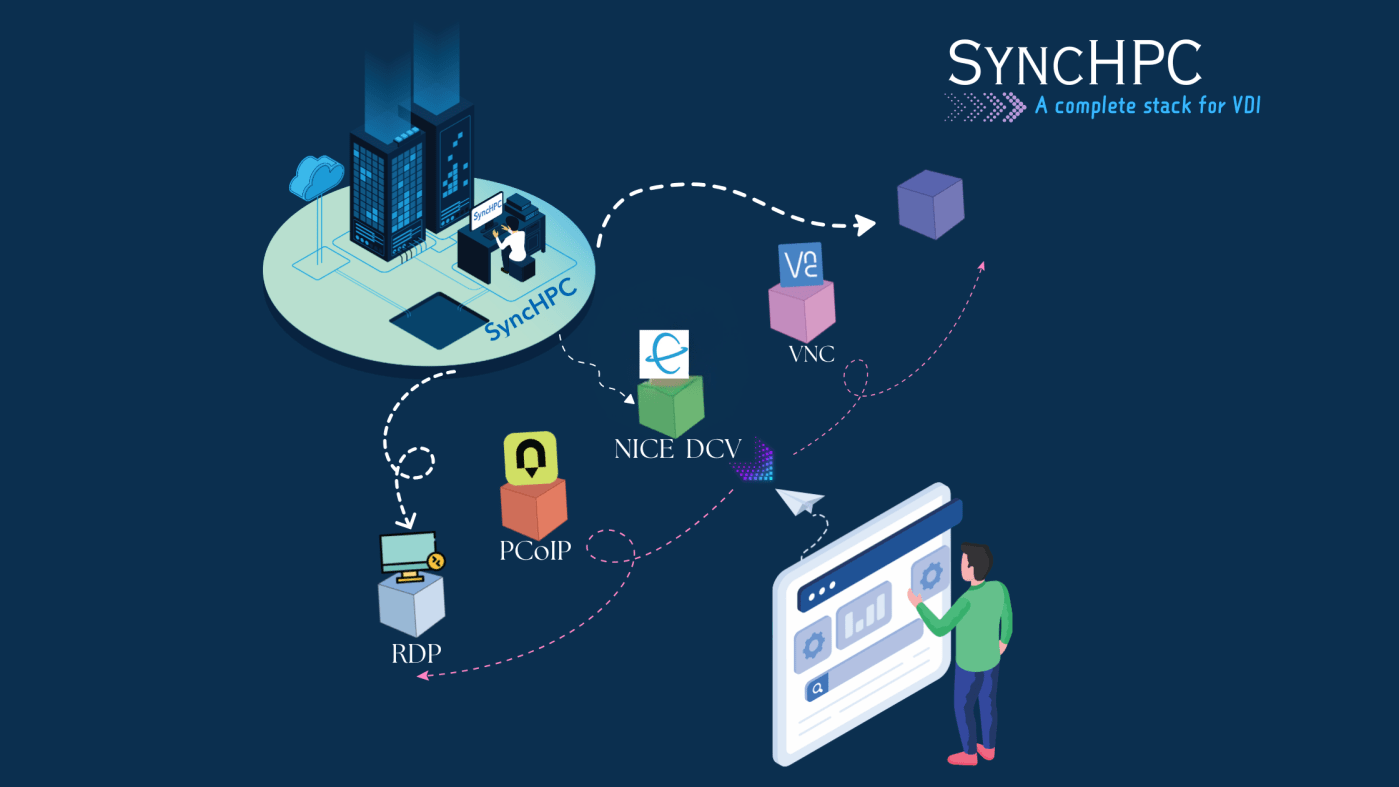 – SyncHPC VDI Supports RDP, VNC, PCoIP, and NICE DCV to cater to diverse use cases.