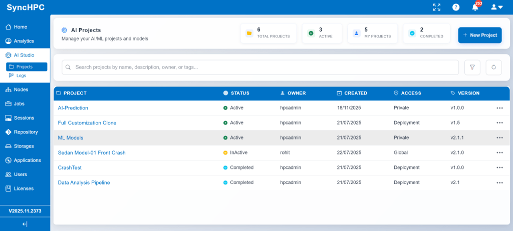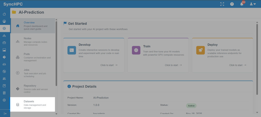 Building, training, and deploying AI/ML models often involves multiple disconnected steps environment setup, dataset management, compute allocation, job execution, and result tracking. SyncHPC simplifies this entire lifecycle by providing guided, UI-driven workflows that help users move seamlessly from development to training and inference.