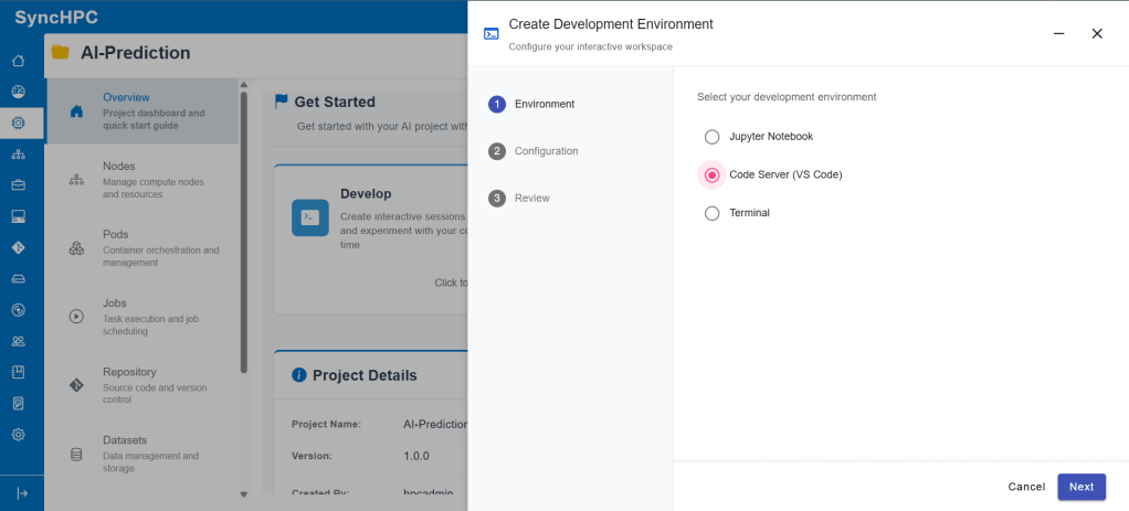 The first step in any AI/ML project is setting up a development environment. SyncHPC removes the complexity of manual configuration by offering pre-defined, ready-to-use environment templates.