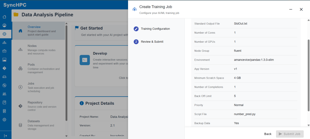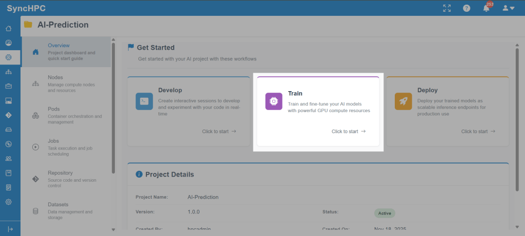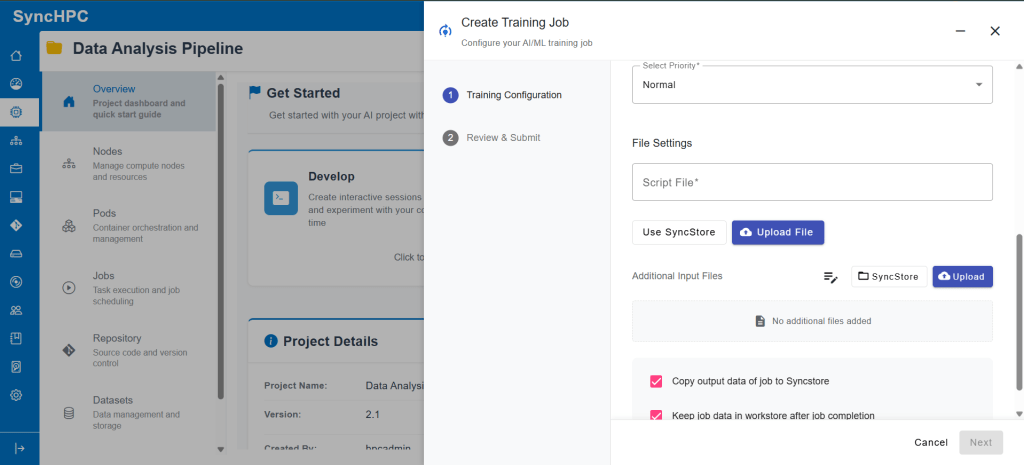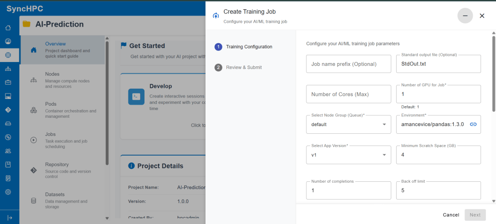 Once the environment and scripts are ready, users can move to model training using SyncHPC’s structured AI/ML Training Job workflow.