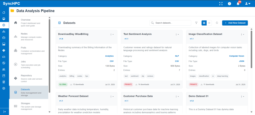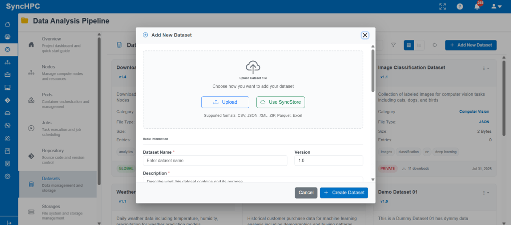 Data plays a central role in AI/ML workflows. SyncHPC provides a flexible dataset management system that supports both new dataset creation and reuse of existing datasets.