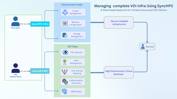 A Role-Based Approach for Infrastructure and VDI Admins Virtual Desktop Infrastructure (VDI) is no longer just about hosting desktops in the cloud. It’s about providing a secure, high-performance, and manageable digital workspace backed by a scalable and agile infrastructure. SyncHPC offers a complete solution for VDI management by cleanly separating the responsibilities between two critical... Continue Reading →